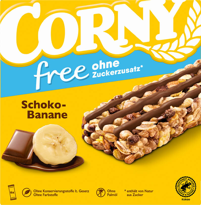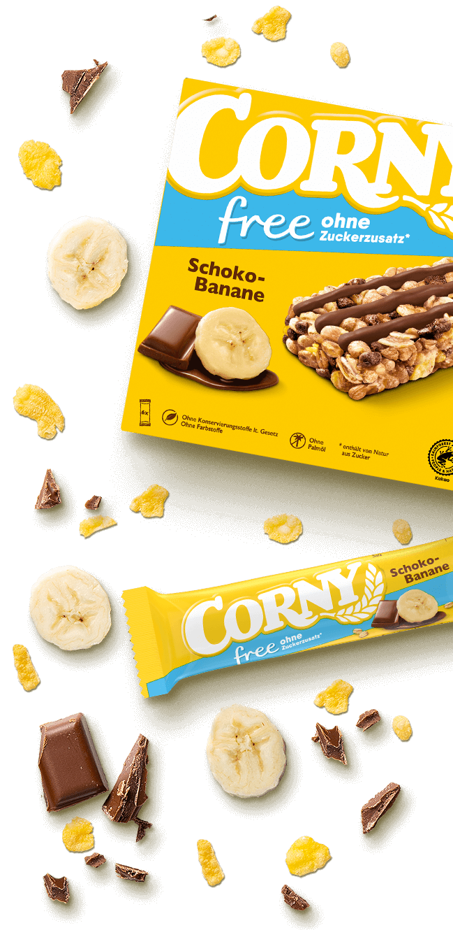 Wir finden, dass niemand auf einen süßen Snack verzichten sollte. Nicht mal die, die auf eine bewusste Ernährung achten. Genau für diejenigen haben wir CORNY free Schoko-Banane mit 38% Vollkorn und ohne Zuckerzusatz. Voller Geschmack bei 69 kcal pro Riegel.