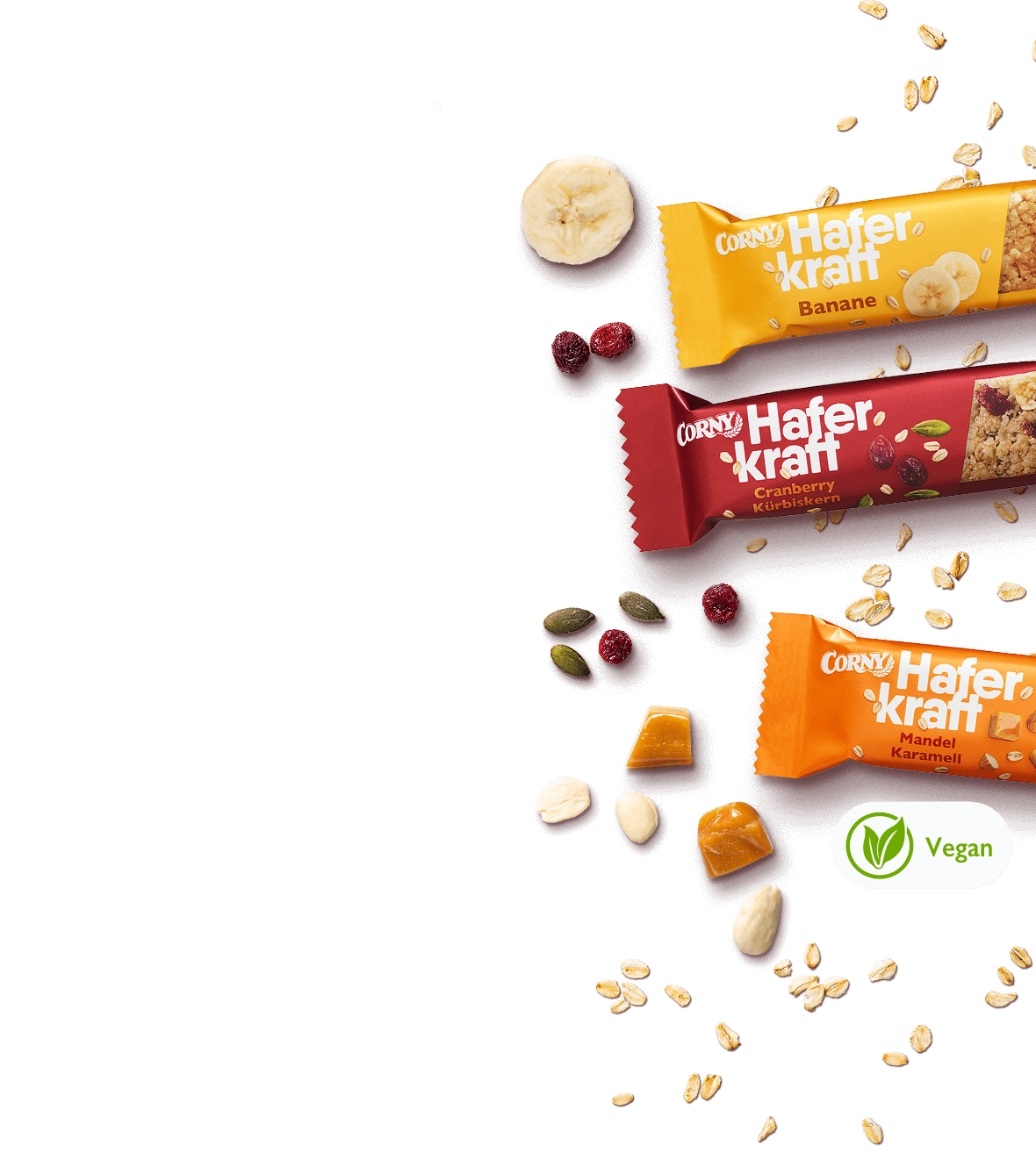 Unser weicher Haferriegel CORNY Haferkraft – ein vielseitiger Snack für wirklich jede Gelegenheit. Ob fruchtig, nussig oder schokoladig – hier kommt jeder auf den Geschmack. Entdecke unsere 5 leckeren Sorten Banane, Cranberry Kürbiskern, Mandel Karamell, Kakao und Haselnuss Kakao. Alle CORNY Haferkraft Riegel sind vegan und kommen ganz ohne Konservierungsstoffe aus.