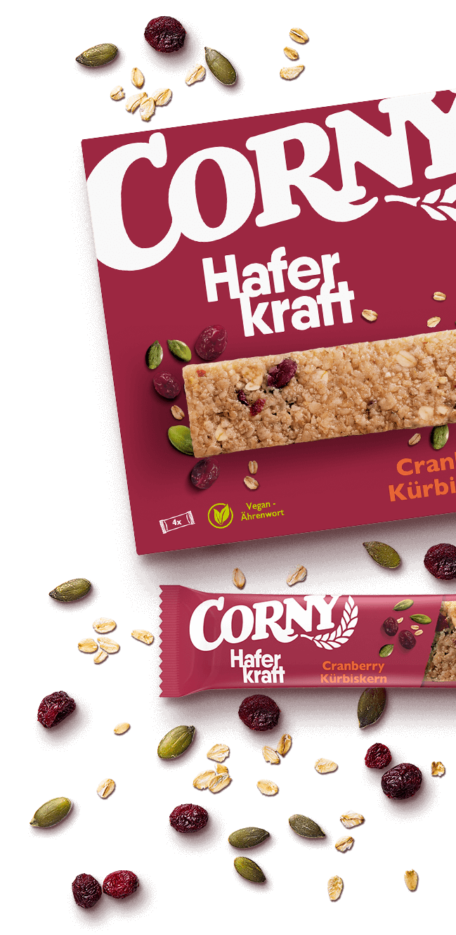 CORNY Haferkraft Cranberry Kürbiskern – dein perfekter Snack für den großen oder kleinen Hunger zwischendurch.