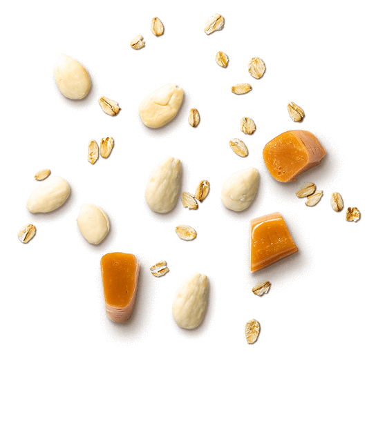 Vollkornhaferflocken 48 %, Glukose-Fruktose-Sirup, Glukosesirup, Kokosfett, geröstete Mandeln 5 %, Karamellzuckersirup 5 %, Salz, natürliches Aroma, Emulgator Lecithine.